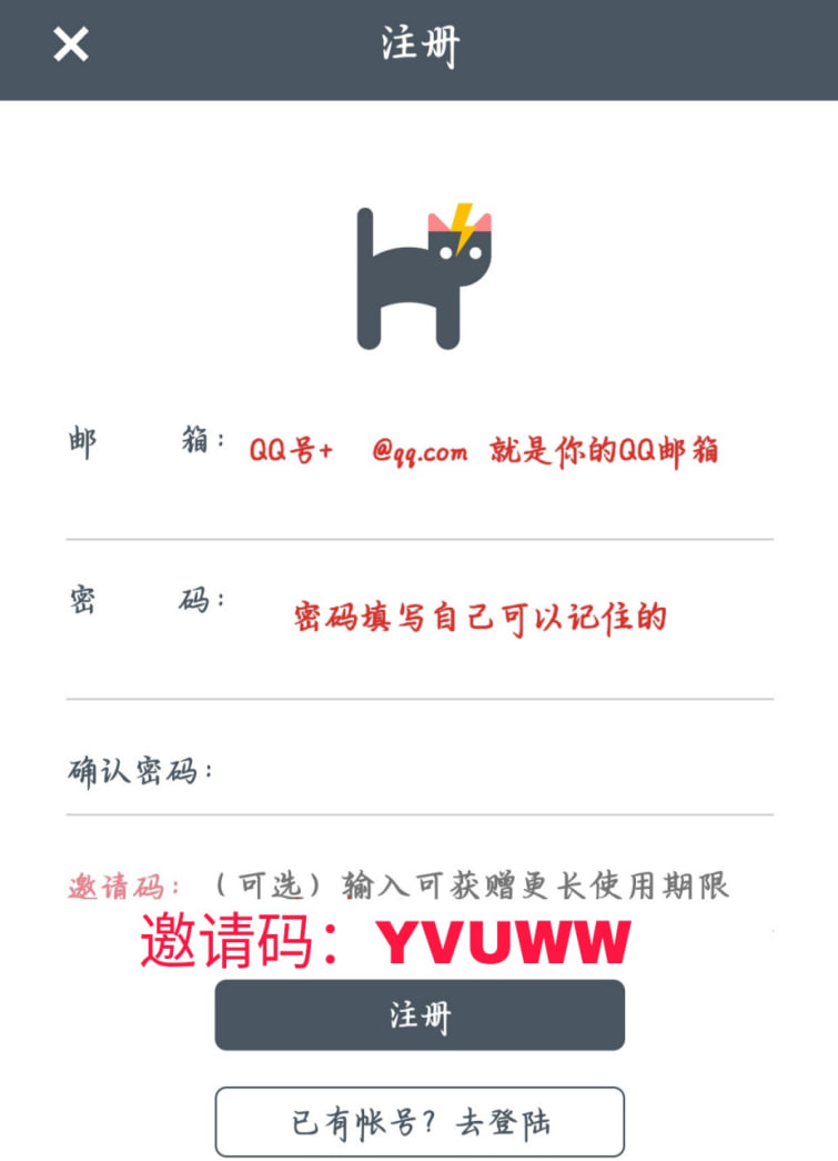 第三步:打开后注册一个账号(格式:使用你的QQ号和手机号都可以,后面加@qq.com)